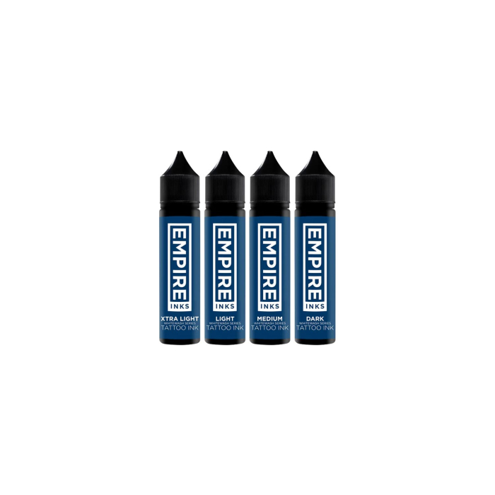 The Whitewash Series Set from Empire Inks is a collection of 4 pre-mixed white washes. All Whitewash inks from Empire Inks are pre-mixed for stability and consistency, allowing artists to get a more deliberate value without having to build up over layers. These inks go into the skin like a grey wash and heal similarly to an opaque grey.