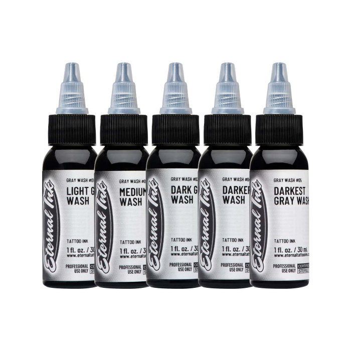 The Eternal Ink Grey Wash Set contains all five pre-made Eternal grey washes: