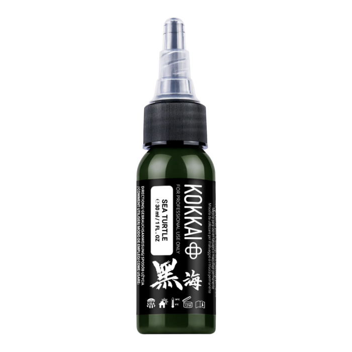 Create organic, natural effects with Kokkai Sumi Ink in Sea Turtle, an earthy dark green with brown undertones perfect for nature, landscape, and animal tattoos. Ideal for shading and adding depth to designs.