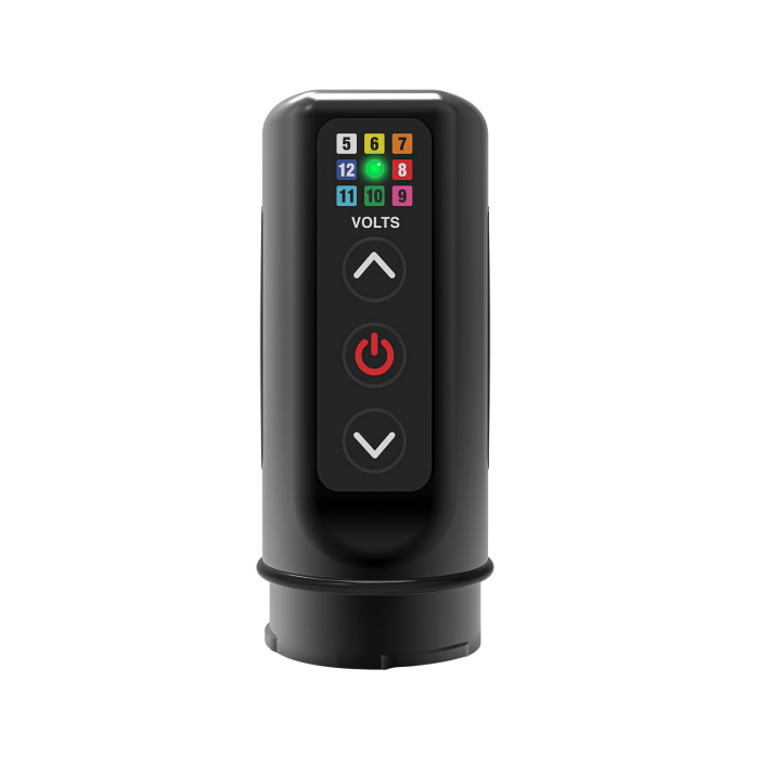 As well as featuring a battery capacity and voltage LED indicator, the PowerBolt+ has three buttons: one to turn the battery pack on/off and two to adjust the voltage quickly and easily. Press the up and down arrows to change the voltage in 0.1 or 0.5 V increments/decrements from 5 to 12 V, with the colour of the LED corresponding to the voltage chart on the PowerBolt+.